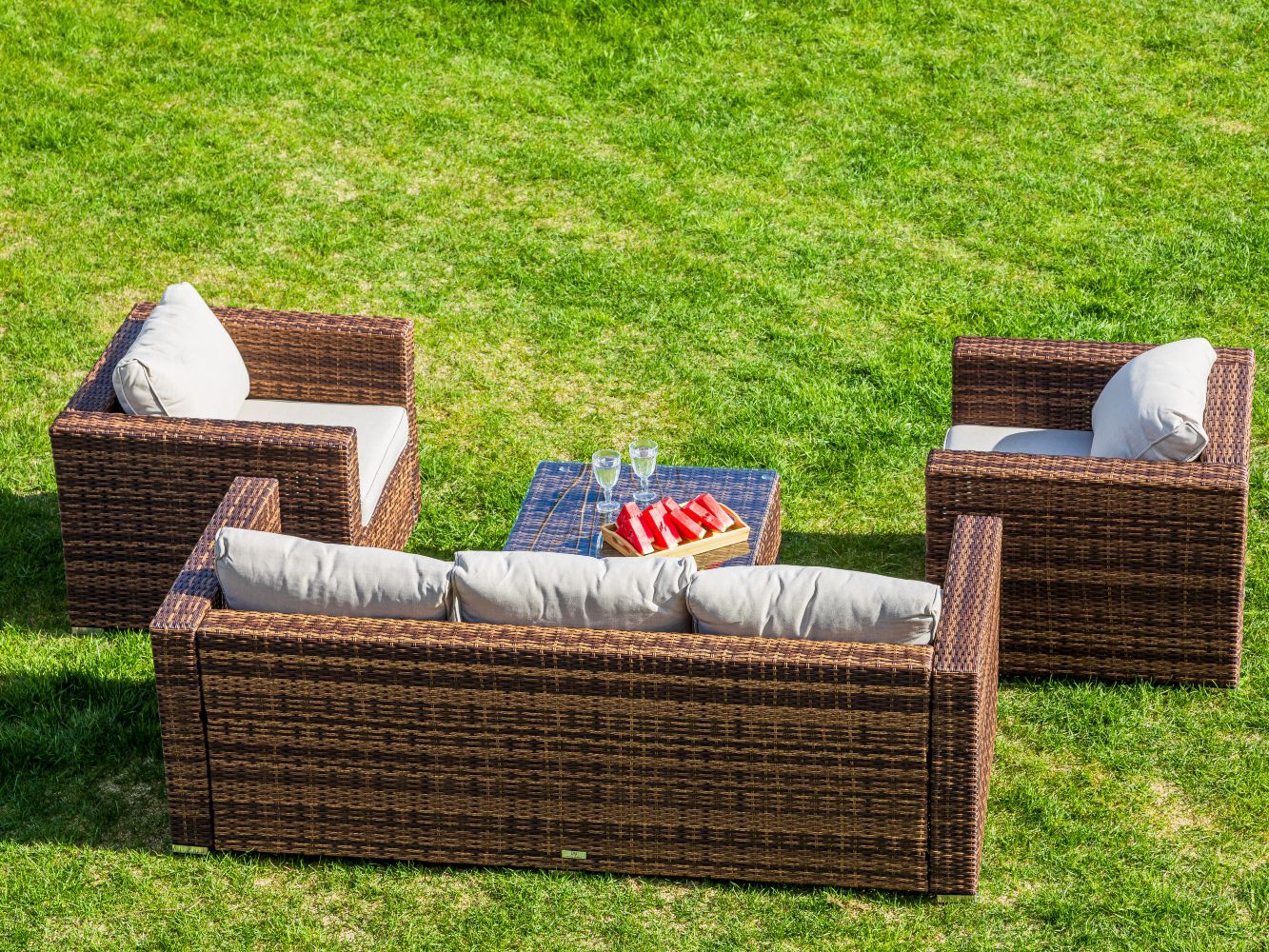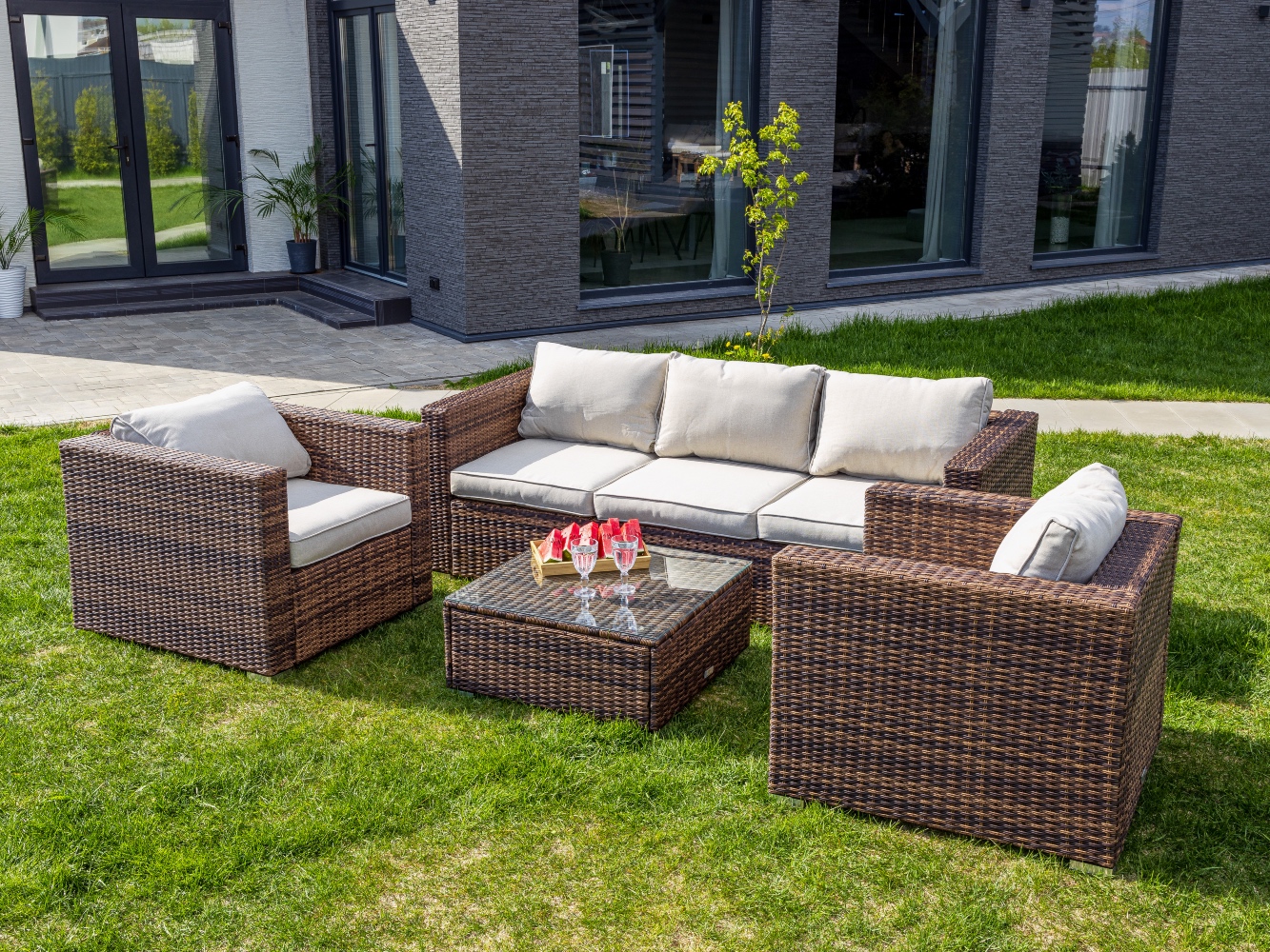 Материал комплекта - искусственный ротанг (ручного плетения)
